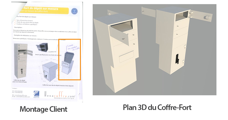 Tout commence quand nous reçevons une demande d'un client avec en pièce jointe un collage photo issu de notre catalogue de coffres-forts. L'idée du client était d'équiper ses magasins avec un coffre-fort de dépôt (pour la collecte des fonds) et d'une colonne de service (pour les fonds de caisse).